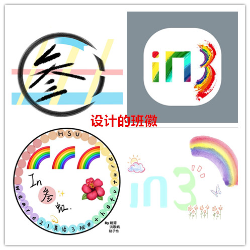 活动初期,班级同学分为11组,每组于2021年12月19日12;00前提交设计图。初期由班委投票筛选三张设计图,最后,由全班同学投票选出“In 3 虹”主题班徽。