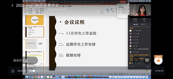 首先,秦雪燕从学习考勤、生活查寝、心理安全、疫情防控和钉钉打卡签到等方面总结11月份各项学生工作。接着,秦雪燕对近期学生工作安排做了详细部署:一是人大代表换届选举工作,对选举流程以及候选人进行简单介绍,学生对人大代表换届选举工作和对自身的权利和义务有了进一步的认识;二是期末考试安排,提醒学生提前准备,及时总结,诚信考试;三是假期安排,强调元旦放假时间、寒假放假安排以及出入校审批和安全问题。