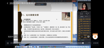 临近期末,为确保年级各项工作正常有序进行,12月15日晚上九点,乐天使体育官网借助钉钉线上平台召开2021-2022学年第一学期期末部署年级班会。会议由20级英语专业辅导员秦雪燕老师主持,20级英语班学生参加会议。会议包含三个部分:11月学生工作总结、近期学生工作安排和假期安排。